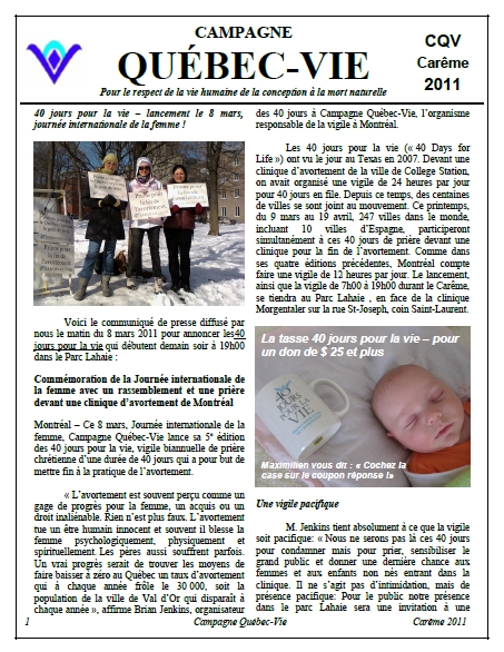 Le 8 mars était la Journée internationale de la femme. La Providence a aussi voulu que ce soit la date du lancement des 40 jours pour la vie (voir le bulletin), ainsi que le jour où Jeanne Mance fut officiellement reconnue par le maire de Montréal, Gérald Tremblay, comme cofondatrice de la ville de Montréal.