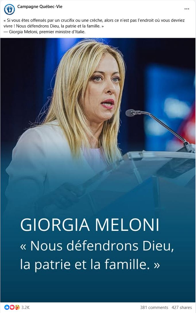 Il nous faut donc donner un message clair, au provincial comme au fédéral, pour la défense du Québec, de nos enfants, de nos aînés et de nos familles, contre tout ce qui détruit ceux-ci, tels l’avortement, l’euthanasie, les cours pervers d’éducation sexuelle et d’idéologie trans, ainsi que le laïcisme qui coupe de Dieu.