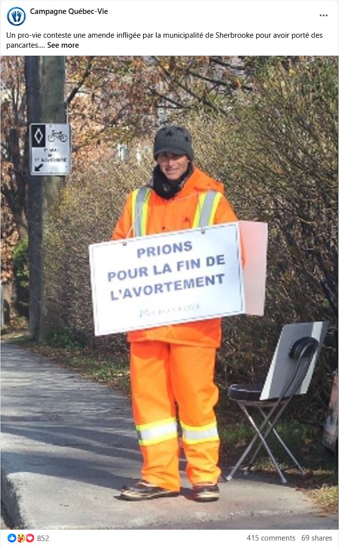 Un pro-vie conteste une amende reçue pour port d'affiches à Sherbrooke
