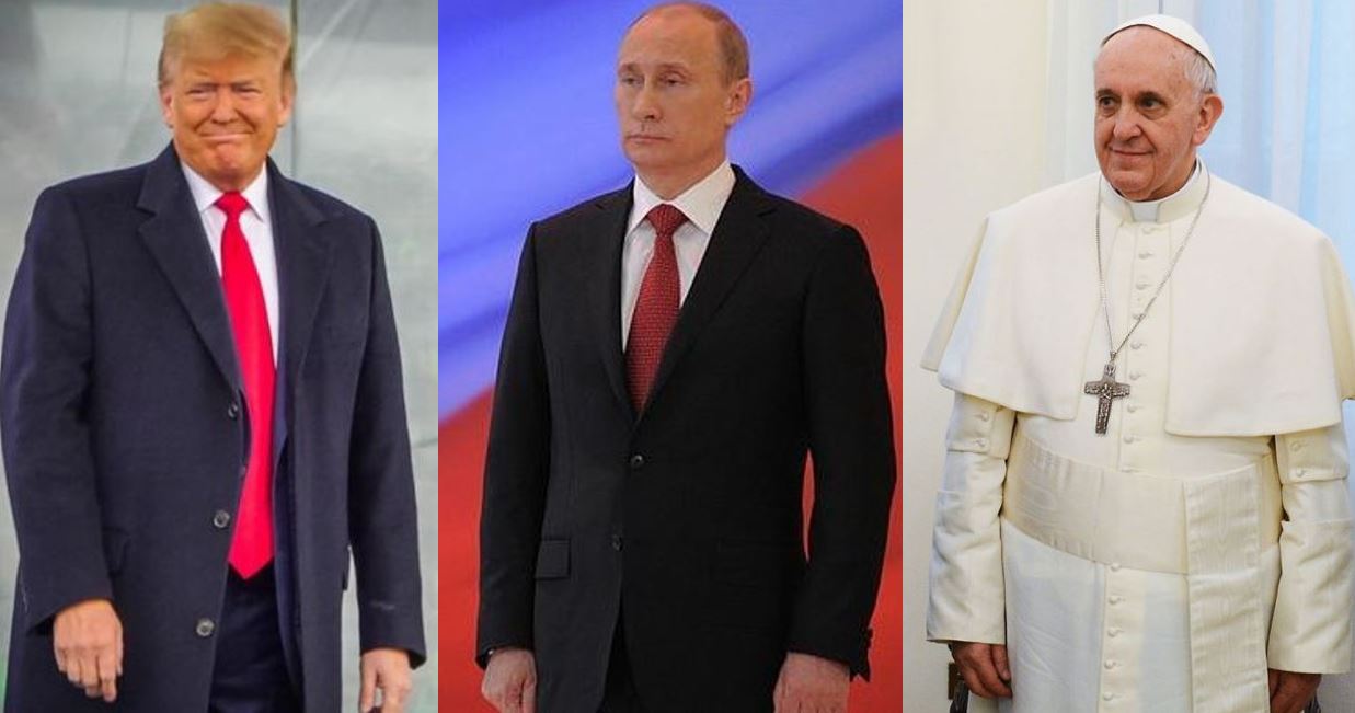 (De la gauche vers la droite) Donald Trump, Wladimir Poutine, pape François. — Image (montage) : Jim Hale/LifeSiteNews, www.kremlin.ru/Wikimedia Commons, Casa Rosada/Wikimedia Commons