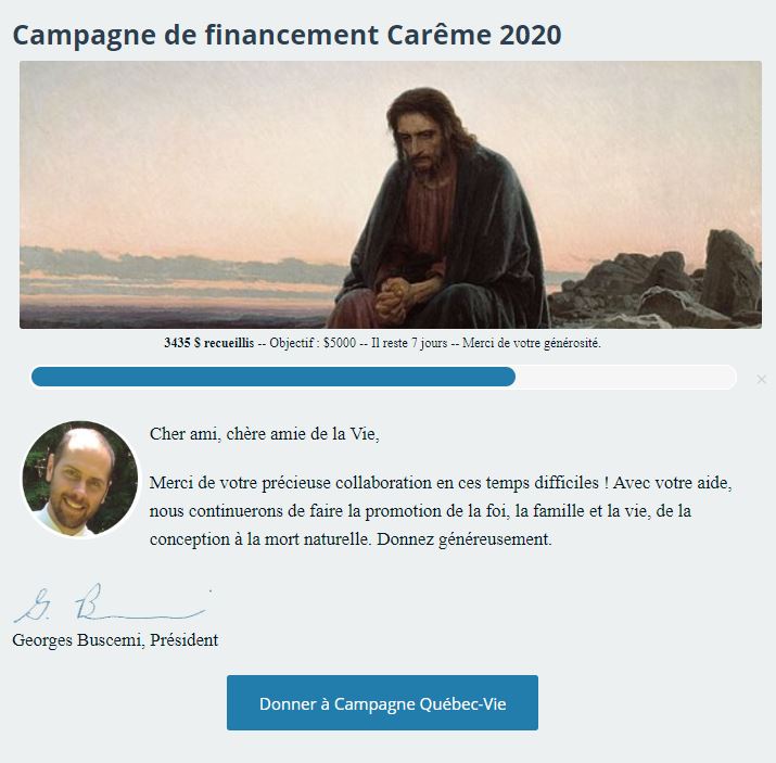 Aussi, je tiens à remercier les nombreux donateurs à notre campagne de financement du carême qui ont su relever le défi et nous aider à atteindre à ce jour la moitié de notre objectif. Il nous reste cependant 2 500 $ à recueillir.