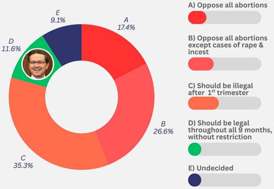 Le sondage a révélé que 79,4 % des électeurs se sont dit fermement opposés à la légalisation de l’avortement en diverses circonstances 11,6 % qui soutiennent la position de Poilievre en faveur d’un accès illimité à l’avortement pendant les neuf mois de grossesse. Les 9 % restants étaient « indécis ».